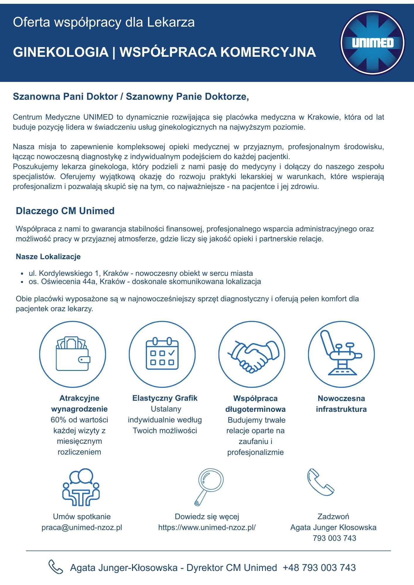 Agata Junger - Kłosowska - Dyrektor Cm Unimed tel. 793 003 743, praca@unimed-nzoz.pl