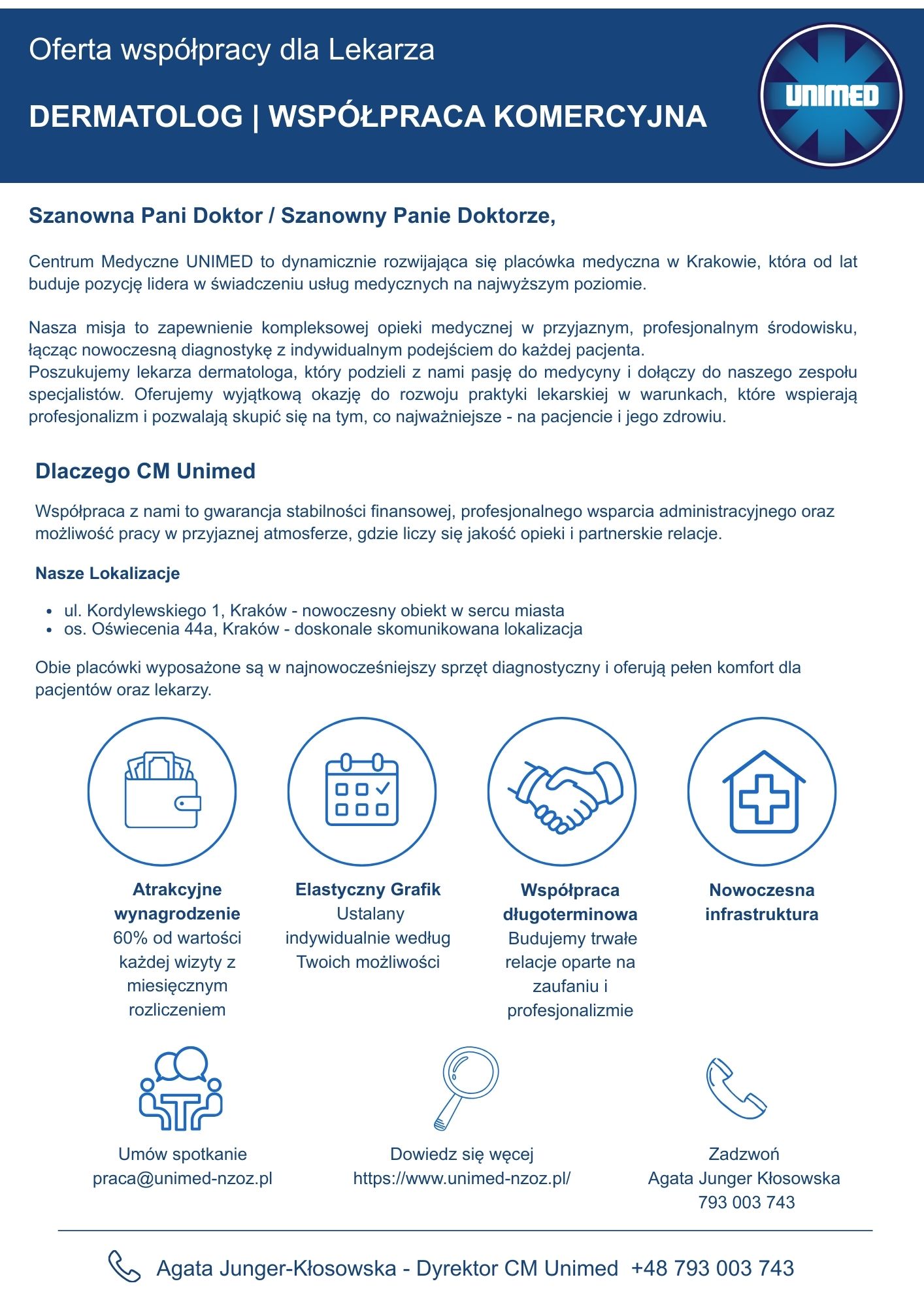 Agata Junger-Kłosowska - Dyrektor CM Unimed +48 793 003 743, praca@unimed-nzoz.pl